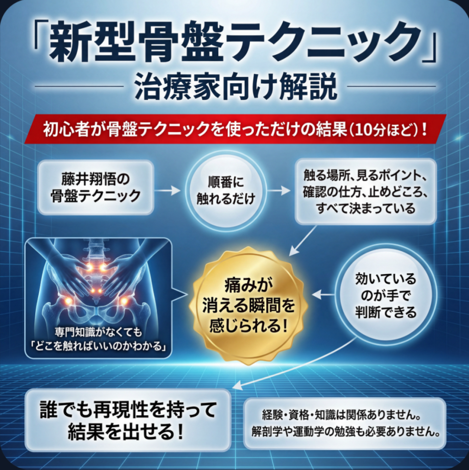 何をしたのかというと、藤井翔悟の「新型骨盤テクニック」を順番通りにやってもらっただけです。